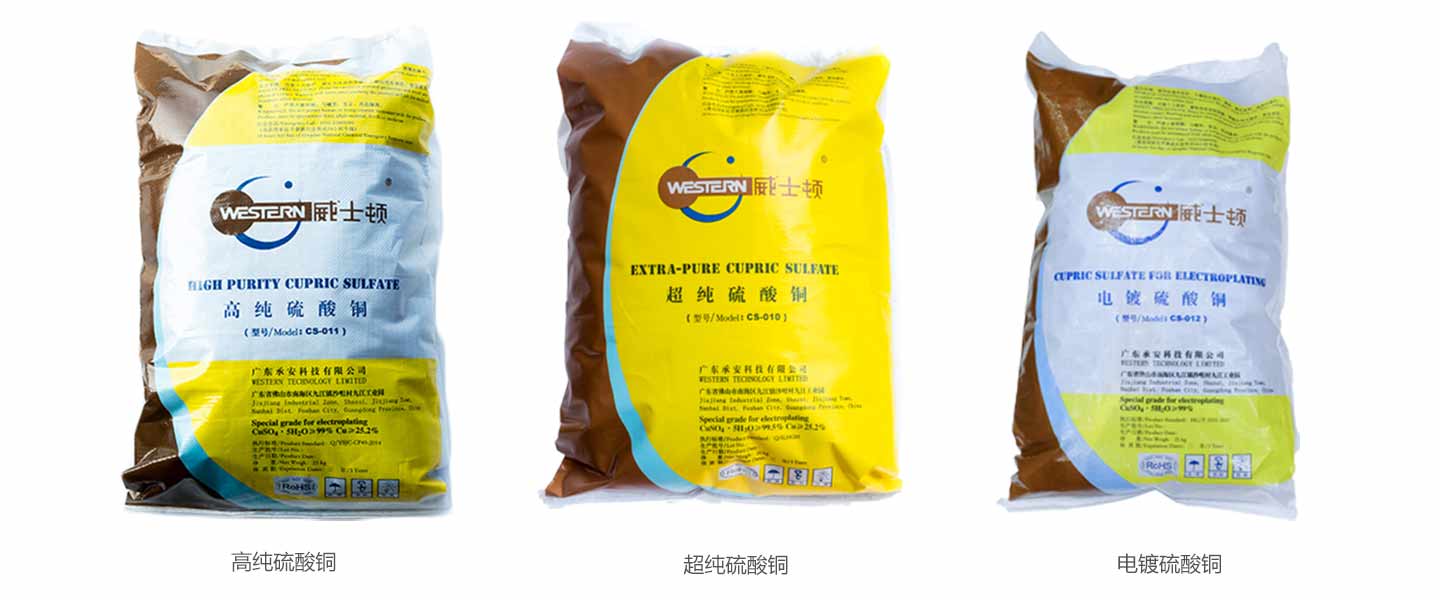 作为硫酸盐镀铜和宽温度全光亮酸性镀铜离子添加剂。此产品由于其杂质钙、镍、砷、钴、铁、铅等含量控制低于国家GB665-88化学试剂硫酸铜标准,故主要用于科研、IT行业等高档电镀场合使用。 在电子线路板制造业中,使用高纯度的精制硫酸铜可以最大限度地避免各种金属杂质和有机杂质被带进镀液中,从而有效地防止镀层出现针孔、麻砂、发黑、发霉等故障,保证了电镀时版面厚度分布等均匀性和对深孔、小孔的深镀能力,并能辅助改善镀层的延展性、抗拉强度等方面的物性。